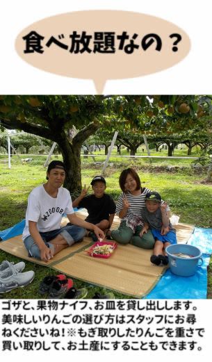 貸し出し | 果物ナイフ・ござ・お皿 ※当園収穫の生りんごジュースの試飲をサービスいたします |